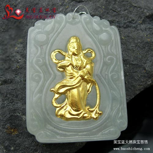 | 【名称】美宝蓝珠宝*千足金镶玉“观音”挂件 |