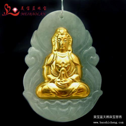 | 【名称】美宝蓝珠宝*千足金镶玉“观音”挂件 |
